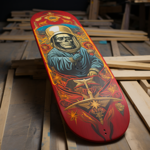 Imagine a skateboard resonating with the vibes of reimagined religious artistry, featuring hyperrealistic murals and Eastern Orthodox iconography. Layered veneer panels evoke a precisionism influence reminiscent of woodcuts, reflecting the spirit of a movement brought forth by artists who dared to challenge the norms.
