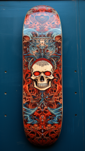Picture a skateboard adorned with a skull pattern in the style of realistic anamorphic art, drenched in dark red and light blue tones. Intricate details and mural painting techniques create a fantastical landscape, accented by bold lines and vibrant colours that showcase detailed craftsmanship at its finest.