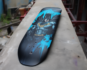 Experience the Batman skateboard—a masterful creation by Dubstar—crafted in the style reminiscent of Loish’s screen printing finesse and digital airbrushing. This board, adorned with dark gray and dark aquamarine tones, echoes the artistry of Bart Sears and Joe Madureira, exuding polished craftsmanship.